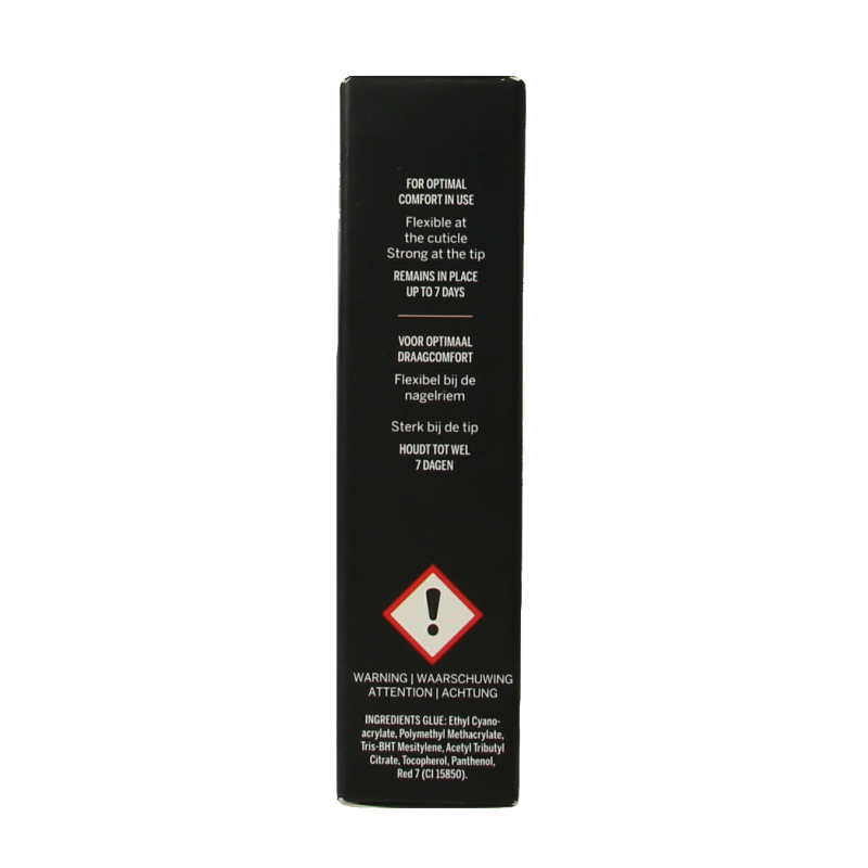 Lijm: Ethyl cyano-acrylate, Polymethyl methacrylate, Tris-BHT mesitylene, Acetyl tributyl citrate, Tocopherol, Panthenol, Red 7 (CI 15850)