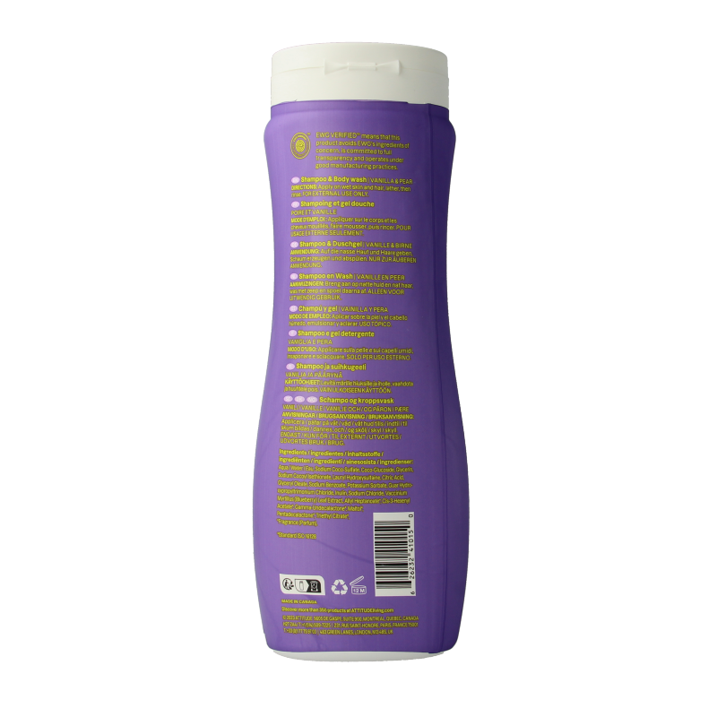 Maak een leuke tijd van het wassen en douchen met ATTITUDE little leaves 2-in-1 Shampoo en body wash – Vanille en peer. Onze zachte, natuurlijke reinigingsformule is perfect voor de delicate huid en haar van je kind. Onze haar en body wash is niet-irriterend, EWG VERIFIED en dermatologisch getest en is gemaakt van natuurlijke ingrediënten zoals het kalmerende extract van bosbessenbad en het ontgiftende extract van moringazaad. Reinig het haar en lichaam van je kind in één stap, wat meer tijd geeft om te spelen!