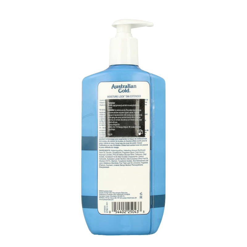 Een meer dan verzorgende aftersun! De Australian Gold "Moisture Lock" aftersun bevat o.a. Aloë Vera, Australische Tea Tree olie, vitamine E, zonnebloemzaadextracten en olijfolie extracten. Moisture Lock houdt het vocht in de huid vast, voedt, verzorgt, hydrateert en houdt je huid zacht, glad en gezond.