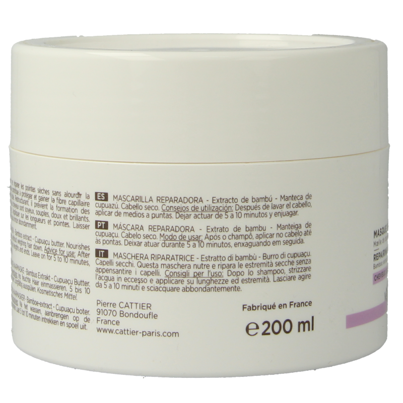 Het biologische, herstellende masker van Cattier heeft een rijke, zachte textuur die droge punten voedt en herstelt zonder het haar zwaar te maken. De met cupuaçuboter en bamboemerg verrijkte formule herstelt en omhult de haarvezels en maakt het haar gemakkelijk doorkambaar. Het masker herstelt de haarstructuur en voorkomt gespleten punten. Het haar wordt sterker, voelt zijdezacht en soepel aan en ziet er glanzend uit.