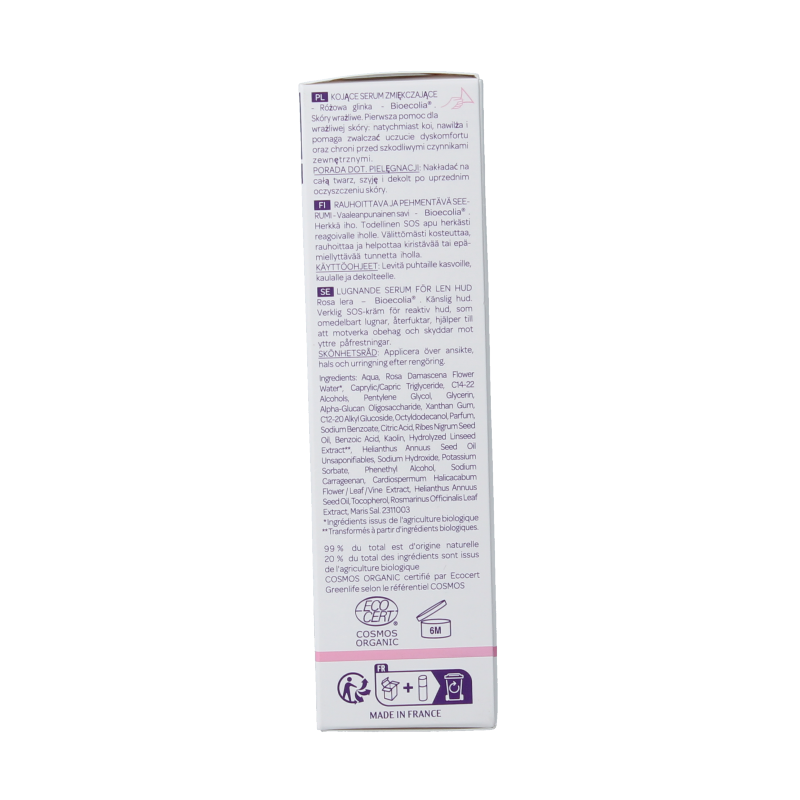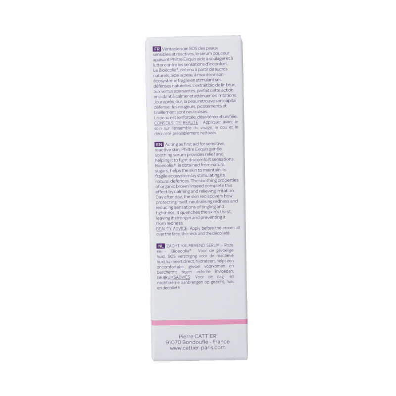 Als een echte SOS-verzorging voor de gevoelige en reactieve huid heeft het rustgevende, zachte biologische serum Philtre Exquis van Cattier een onmiddellijk kalmerend effect. Het product hydrateert de huid meteen en verlicht het oncomfortabele gevoel. Het serum combineert Defensil®-Plus, een innoverend actief complex dat irritaties tegengaat en de huid beschermt, met een biologisch extract van bruin lijnzaad. Dit extract beschermt de opperhuid tegen schadelijke invloeden van buitenaf, houdt de huidgevoeligheid onder controle en voorkomt rode plekken. De Bioécolia®, gewonnen uit natuurlijke suikers, leert de huid opnieuw hoe deze haar kwetsbare ecosysteem moet onderhouden door de natuurlijke bescherming te stimuleren. Dag na dag heractiveert de huid haar natuurlijke verdedigingssystemen en worden rode, jeukende en trekkende plekken geneutraliseerd. Het roodwierextract in de formule stimuleert de aanmaak van hyaluronzuur, een zuur dat van nature in de huid aanwezig is. Daardoor werkt het serum hydraterend en herstructurerend en voelt de huid comfortabeler aan. De roze klei is rijk aan mineralen en sporenelementen, verzacht en kalmeert de huid en laat de teint oplichten. De huid wordt beter gevoed, sterker en egaler. Met biocertificaat - Hypoallergeen