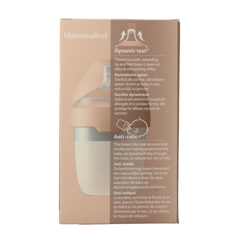De Mammafeel fles heeft een matte textuur waardoor deze comfortabel in hand ligt en extra grip biedt. De duidelijk zichtbare inhoudsaanduiding op de fles helpt de hoeveelheid melk die je baby drinkt te controleren.