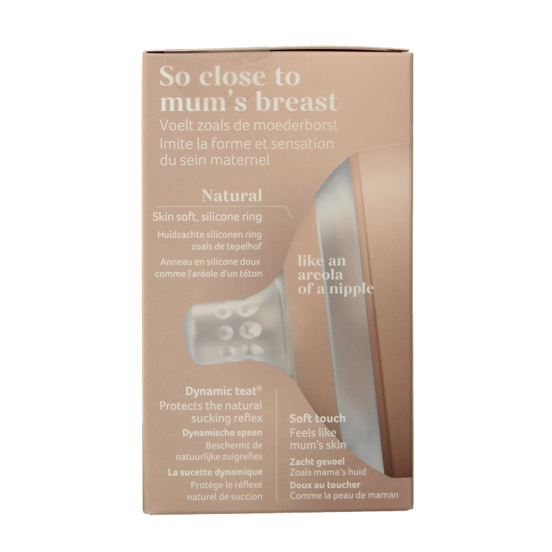 Het unieke design van de flessenspeen bevordert de juiste drinkhouding en vrij ademen door de neus. Zo krijgt je kindje geen onnodige lucht binnen via de mond en voorkomt darmkrampjes. Het zachte oppervlak van de speen imiteert de huid en de textuur van de moederborst. Dit beschermt de band tussen jou en je baby, en zorgt voor een natuurlijk drinkgevoel.