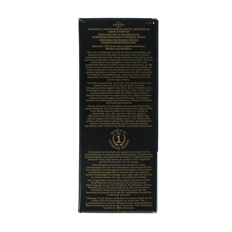 Ultradun en -gemaakt van nitril, een materiaal dat zich aanpast aan de vorm van de penis en meer lichaamswarmte afgeeft dan latex. Durex Intensity is zo ontworpen dat je alleen jouw partner voelt. Geen enkel voorbehoedsmiddel biedt een 100% betrouwbare bescherming tegen zwangerschap, hiv (aids) of andere seksueel overdraagbare aandoeningen.