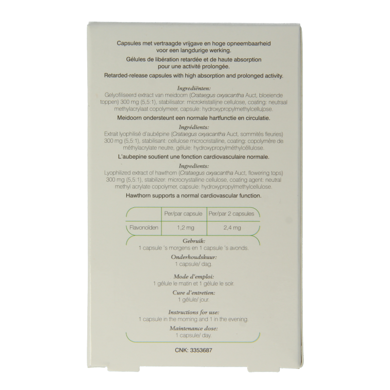 Gelyofiliseerd extract van meidoorn (Crataegus oxyacantha Auct, bloeiende toppen) (5,5:1) 300 mg, stabilisator: microkristallijne cellulose, coating: neutraal methylacrylaat copolymeer, capsule: hydroxypropylmethylcellulose.