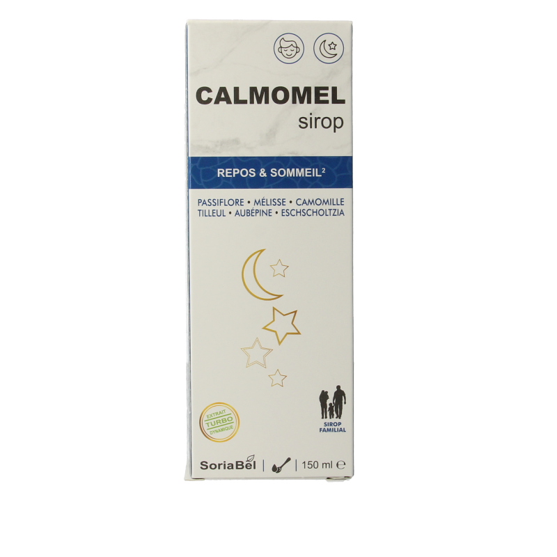 Calmomel siroop bevat gepatenteerde, turbo-dynamische vloeibare extracten van passiebloem 800 mg, melisse 600 mg, kamille 300 mg, linde 300 mg, meidoorn, 200 mg, slaapmutsje 100 mg en natuurlijke essentiële oliën van citroen, lavendel en den.