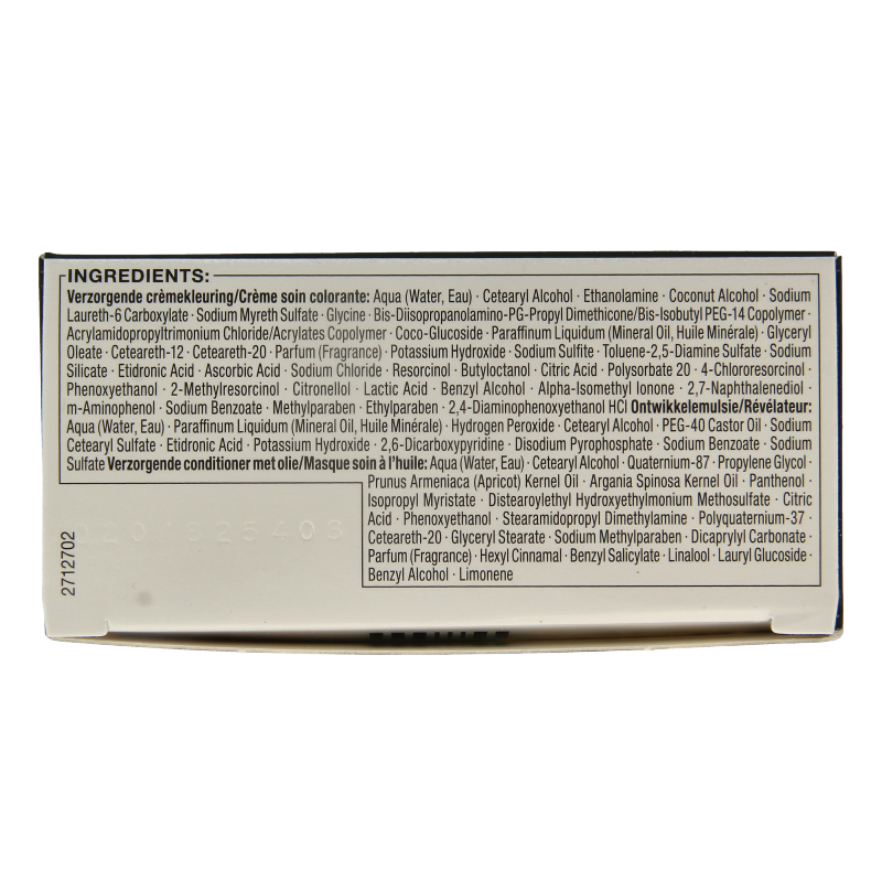 Verzorgende crèmekleuring: Aqua (Water, Eau), Cetearyl Alcohol, Ethanolamine, Coconut Alcohol, Sodium Laureth-6 Carboxylate, Sodium Myreth Sulfate, Glycine, Bis-Diisopropanolamino-PG-Propyl Dimethicone/Bis-Isobutyl PEG-14 Copolymer, Acrylamidopropyltrimonium Chloride/Acrylates Copolymer, Coco-Glucoside, Paraffinum Liquidum (Mineral Oil), Glyceryl Oleate, Ceteareth-12, Ceteareth-20, Parfum (Fragrance), Potassium Hydroxide, Sodium Sulfite, Toluene-2,5-Diamine Sulfate, Sodium Silicate, Etidronic Acid, Ascorbic Acid, Sodium Chloride, Resorcinol, Butyloctanol, Citric Acid, Polysorbate 20, 4-Chlororesorcinol, Phenoxyethanol, 2-Methylresorcinol, Citronellol, Lactic Acid, Benzyl Alcohol, Alpha-Isomethyl Ionone, 2,7-Naphthalenediol, m-Aminophenol, Sodium Benzoate, Methylparaben, Ethylparaben, 2,4-Diaminophenoxyethanol HCl. Ontwikkelemulsie: Aqua (Water, Eau), Paraffinum Liquidum (Mineral Oil), Hydrogen Peroxide, Cetearyl Alcohol, PEG-40 Castor Oil, Sodium Cetearyl Sulfate, Etidronic Acid, Potassium Hydroxide, 2,6-Dicarboxypyridine, Disodium Pyrophosphate, Sodium Benzoate, Sodium Sulfate. Verzorgende conditioner met olie: Aqua (Water, Eau), Cetearyl Alcohol, Quaternium-87, Propylene Glycol, Prunus Armeniaca (Apricot) Kernel Oil, Argania Spinosa Kernel Oil, Panthenol, Isopropyl Myristate, Distearoylethyl Hydroxyethylmonium Methosulfate, Citric Acid, Phenoxyethanol, Stearamidopropyl Dimethylamine, Polyquaternium-37, Ceteareth-20, Glyceryl Stearate, Sodium Methylparaben, Dicaprylyl Carbonate, Parfum (Fragrance), Hexyl Cinnamal, Benzyl Salicylate, Linalool, Lauryl Glucoside, Benzyl Alcohol, Limonene.