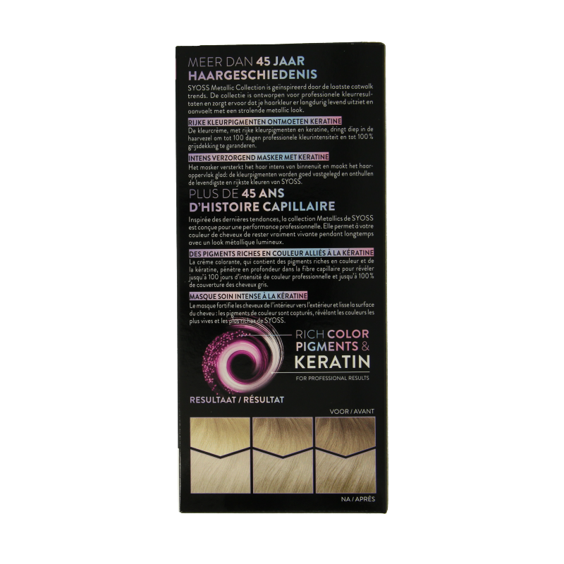 SYOSS Metallic Collection is geïnspireerd door de laatste catwalk trends. De collectie is ontworpen voor professionele kleurresultaten en zorgt ervoor dat je haarkleur er langdurig levend uitziet en aanvoelt met een stralende metallic look.