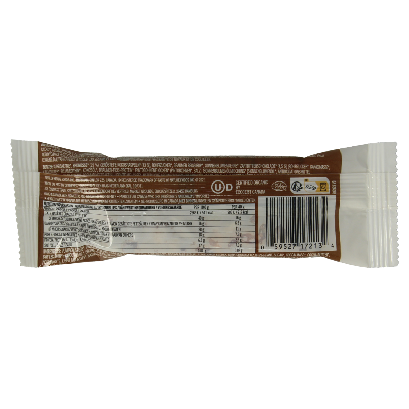 Pompoenpitten*, PINDA"S 21%, Geroosterde kokosrasp* 13%, Bruine rijstssiroop, Zonnebloempitten*, donkere chocolade* 4,5% (rietsuiker*, cacaomassa*, cacaoboter*, SOJA lecithine*, Kokosolie*, Bruine rijstproteïne*, Pintobonenvlokken* (pintobonen*, zout, zonnebloemoliemengsel (zonnebloemolie*, antioxidant (tocopherolhaltiger extract, rozemarijnextract*), Lichte melasse*, natuurlijke aromastoffen*, Geleermiddel (agar agar) * van gecontroleerde biologische teelt
