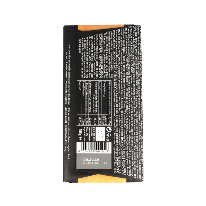 Cacaomassa*, Ruwe rietsuiker*, Cacaoboter*, sinaasappelolie*. Cacao tenminste 70%. *Van biologische landbouw