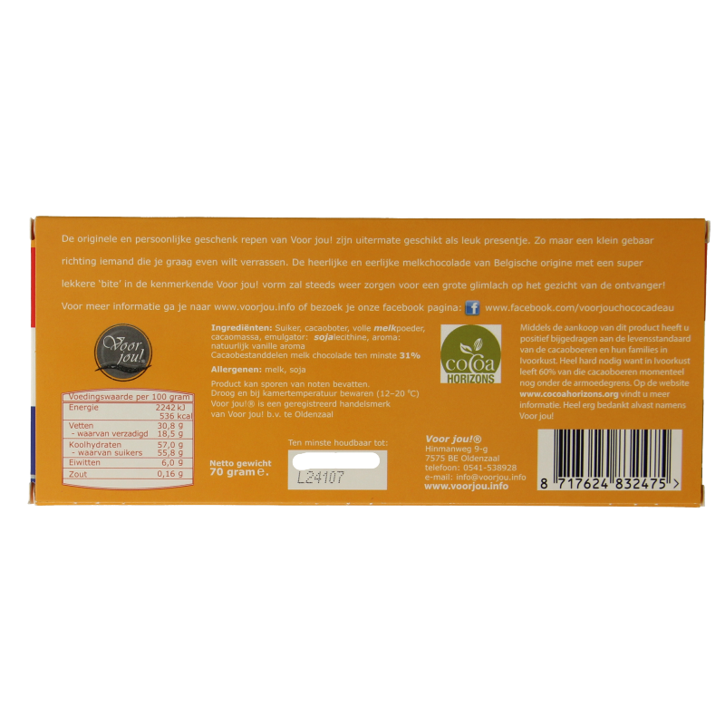 Suiker, cacaoboter, volle MELKpoeder, cacaomassa, emulgator: SOJAlecithine, aroma: natuurlijke vanille aroma Cacaobestanddelen melk chocolade ten minste 31%
